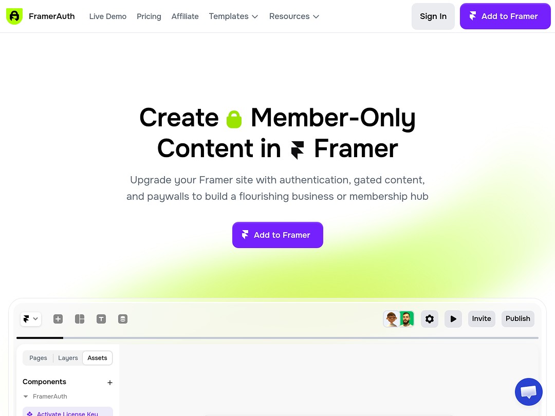 FramerAuth adds authentication and member-only content to your Framer site without code. Drag and drop sign-in, sign-up, and password reset components, lock pages or sections, and integrate with Lemon Squeezy for paid memberships. Thousands of sites already use it for gated content, courses, and digital product access.